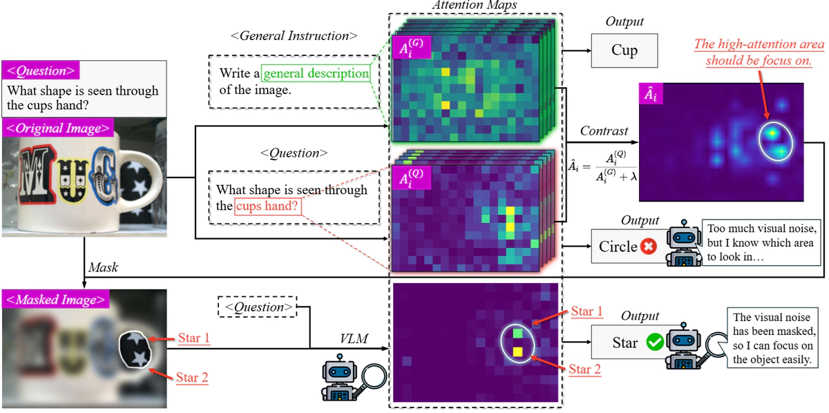 在上一章节我们证明了使用掩盖视觉噪声能够提高VLM的性能,于是作者团队考虑如何将视觉噪声掩盖自动化。为此,研究团队提出了基于对比注意力的理论框架。
